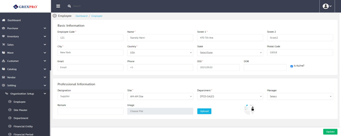 You can update all the information except the Employee Code. After editing the information, you need to click on the Update button located at the bottom-right corner to store the details on the system.