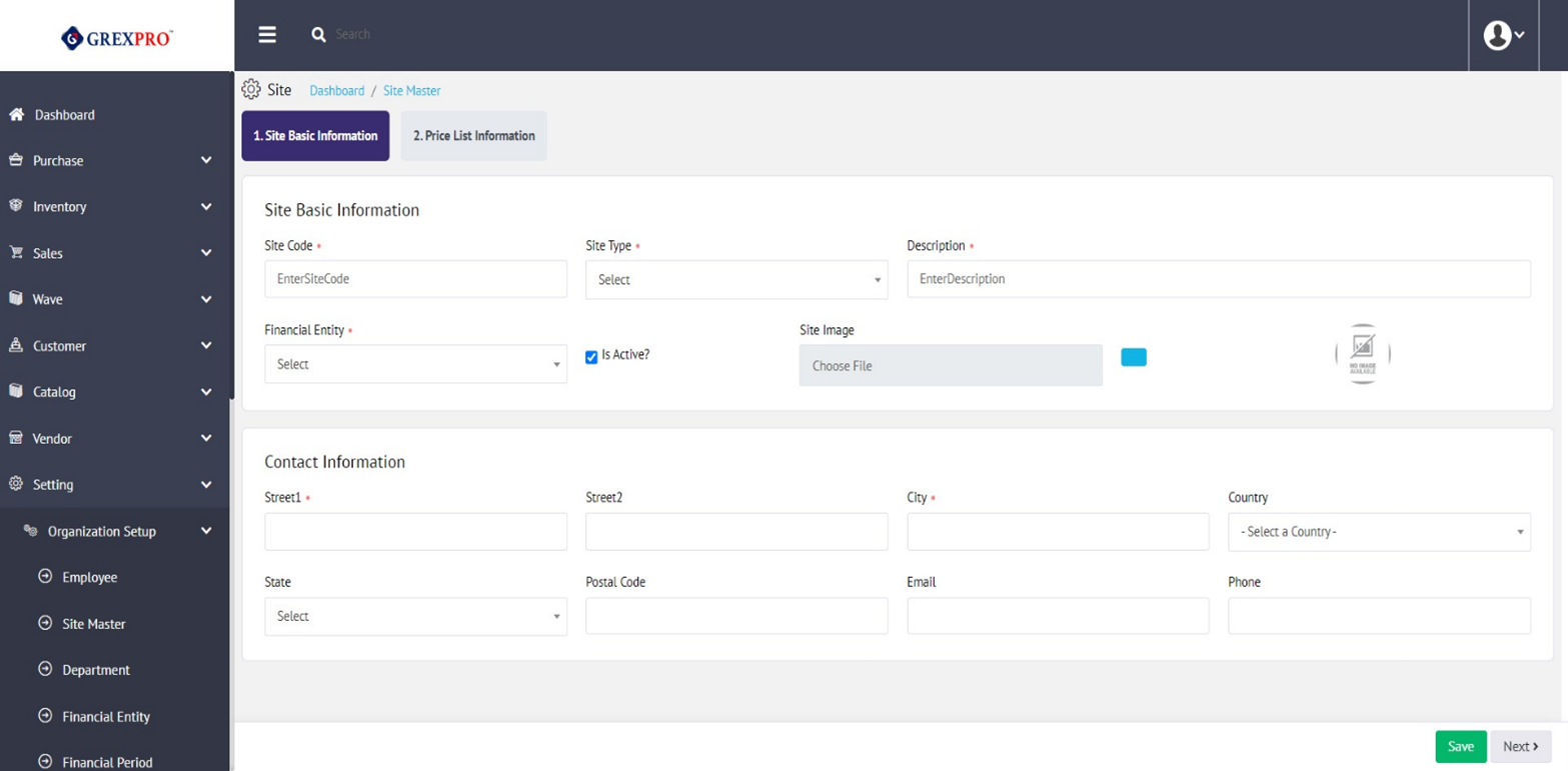 Here, you need to provide the basic information including site code, site type, description, financial entity, and address. There are a few optional fields like including email, phone number, images, etc.,. which you can leave blank. Before moving to the next step, you need to save the information by clicking the 'Save' button given on the bottom-right corner. Once you have saved the info, click on the 'Next' button.