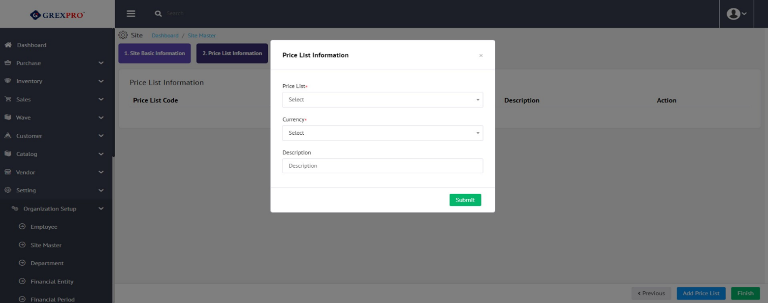 It will open the following pop-up where you need to select Price List and Currency, whereas the Description field is optional. After selecting the required information, click on submit.