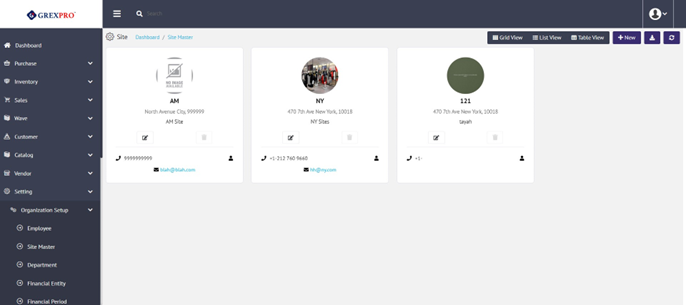 Site information refers to the various locations within the organization. These sites may or may not be warehouses; they may be headquarters, sales offices, or other such locations. Inventory operations are always based on warehouses. However, other sites may play a role in other ways within the application. You can see a list of all sites in three different views, including Grid View, List View, and Table View.