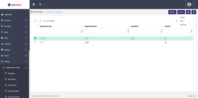 If a department is not in use, you can change the status of that department using the Inactive/Active option from the Action dropdown.