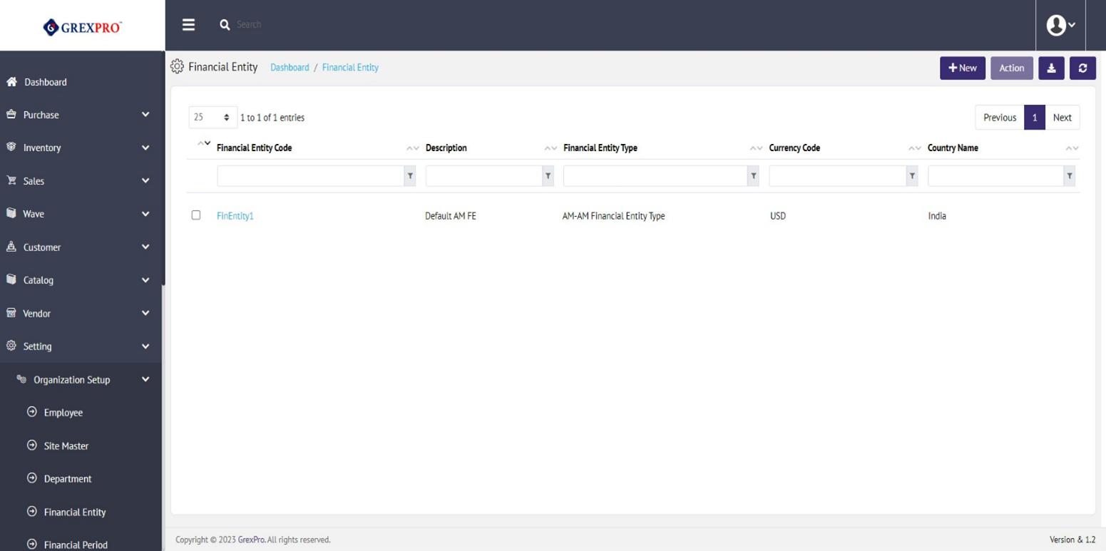 Financial Entities are organizational units that are used in all financial-related transactions within the application. All transactions that have a financial component - e.g., purchase orders, sales orders, and invoices - must specify a financial entity code. On the landing page of Financial Entity Master, you can see a list of all the Financial Entities.