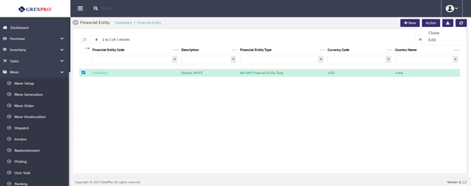 You can easily create a duplicate Financial Entity only by giving a unique Financial Entity Code. To clone an entry, select a Financial Entity from the Financial Entities' list, click on the Action button located at the top-right corner of the screen and select the Clone option from the list.