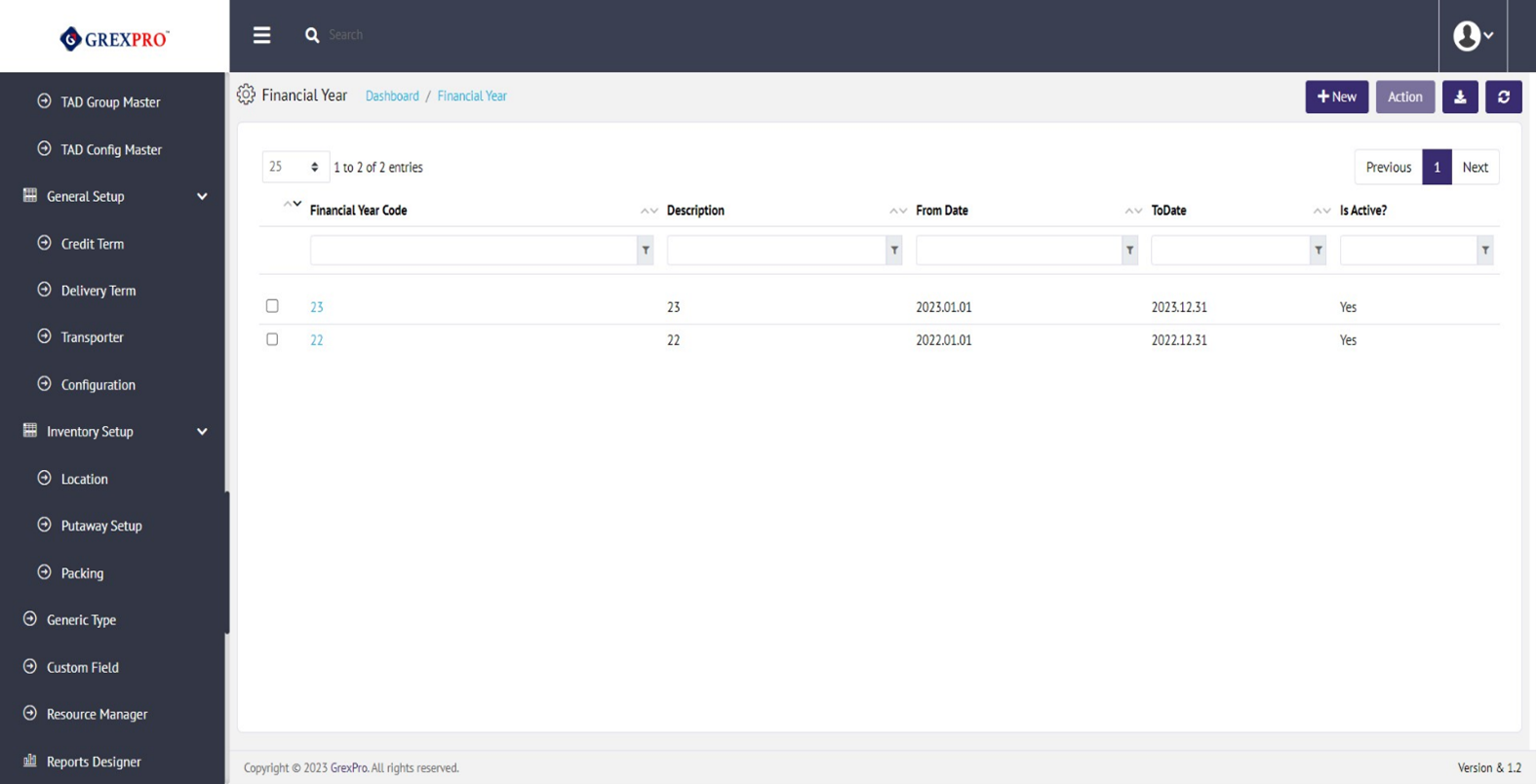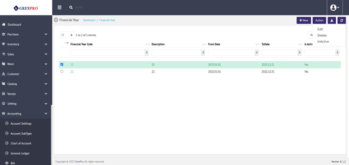 You can change the status of Financial Year entry by clicking on the Inactive/Active option from the Action dropdown.