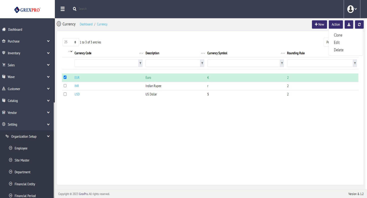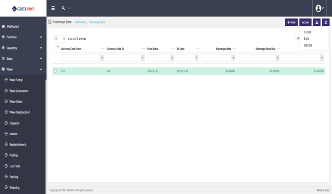 To clone an entry, select a department, click on the Action button located at the top-right corner of the screen, and select Clone option from the list. You cannot add an exchange rate with the same currency code and date range.