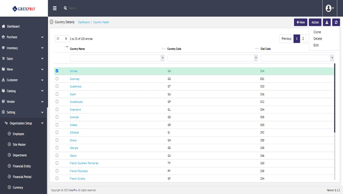 Select the country code entity you want to delete, click on the 'Action' button located at the top-right corner, and click on the Delete from dropdown.