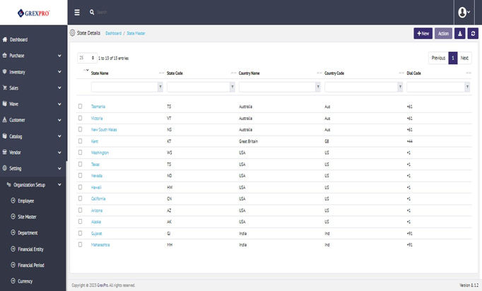 State Master contains the state name, state code, country name, code, and dial code information used for location data within the application. On the landing page, you can see a list of all country codes entities.