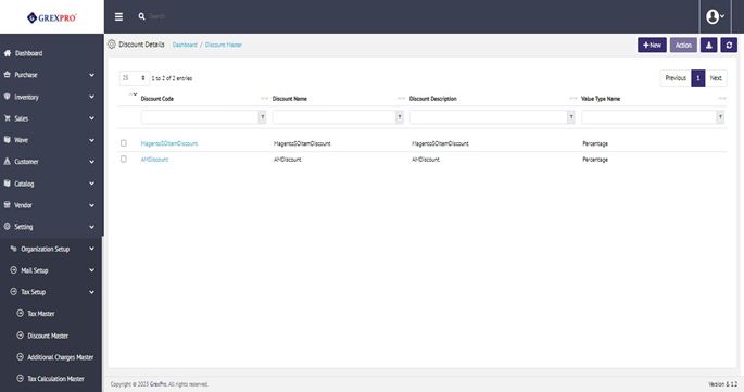 The Delete option is only available for entries which that are not interlinked with other modules of the system. To delete an entry, you need to select an entry and click onthe 'Action' button located at the top right corner of the screen and, click on the 'Delete' option from the dropdown.