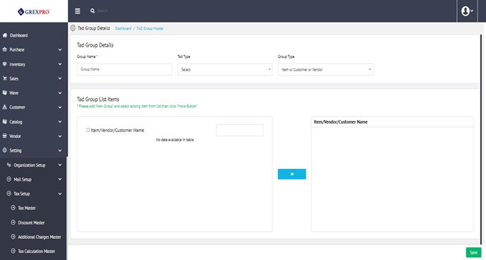 To add a new Tad Group, you need to click on the 'New' button located at the top-right corner of the screen, which will open the following page. YWhere you need to select Tad type and Group type from respective dropdowns,; followed by defining a new group using the Add New Button and moving items to that group using the arrow button.