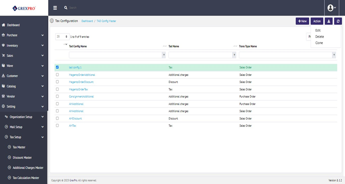 To clone an entry, select a tax entry, click on the Action button located at the top-right corner of the screen and select the Clone option from the list.
