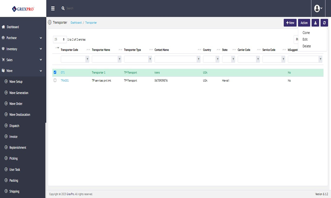 There are two ways to edit an entry, either click on the Transporter Code or select an entry which you want to edit., Cclick on the Action button located at the top-right corner of the screen and select Edit from the dropdown.