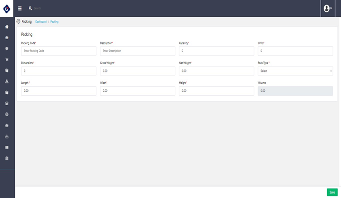 To add new Packing, you need to click on the 'New' button located at the top-right corner of the screen which will open the following page where you need to provide the required information: