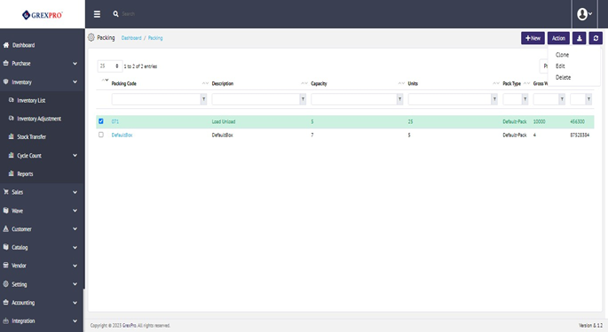 There are two ways to edit an entry, either click on the Packing Code or select an entry which that you want to edit, click on the Action button located at the top-right corner of the screen and select Edit from the dropdown.