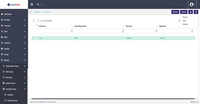 The Delete option is only available for entries which are not interlinked with other modules of the system. To delete an entry, you need to select an entry and by clicking on the 'Action' button located at the top right corner of the screen, and then clicking on the 'Delete' option from the dropdown.