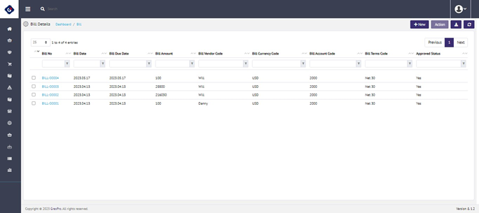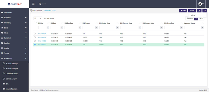 You can view the information of the existing account field by clicking on the Bill No. from the custom field list. Another way to view custom type information is by selecting a specific entity and clicking on the 'Action' button located at the top right corner of the screen. This will open a dropdown and you need to click on the View option from the dropdown: