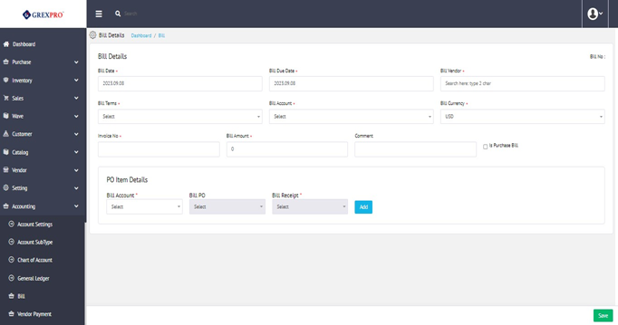 To create a bill, click on the a New button located at the top-right corner of the Bill details, which will lead you to the following screen. Here, by filling in the Bill details and PO Item information you can create a new type of bill. In PO Item Details Bill PO, Bill Receipt will not be u neditable.