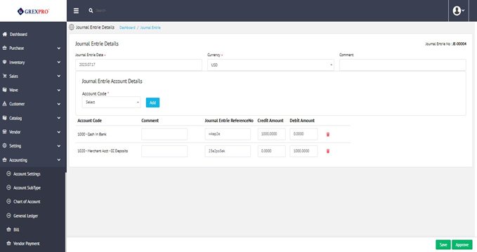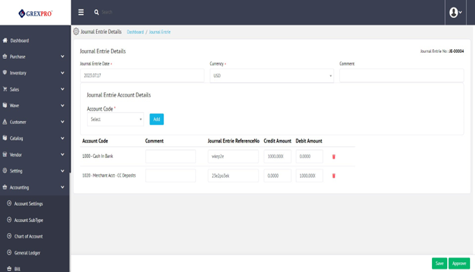 To add a new journal entry detail, click on the a New button located at thetop-right corner of the Journal Entrie Page, which will lead you to the following screen. Here, by filling in Journal entryie details, account details list with account code reference number credit amount, and debit amount.
