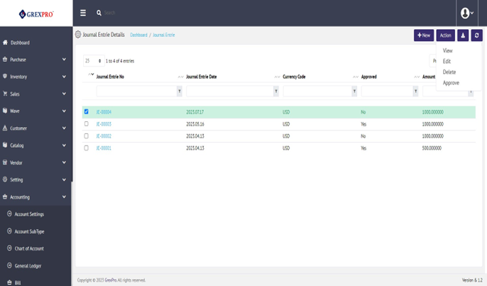 In case you have created a journal entrie , but haven't approved it, select it from the list and click on the Approve from action list.