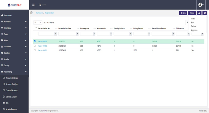 In case you have created a reconciliation no., but haven't approved it, select it from the list and click on the Approve button from the action list.