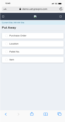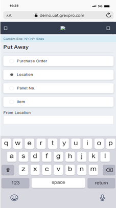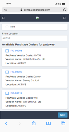 To perform Put Away using PO, you need to select Purchase Order, followed by entering the location in the text box. Here, you can see a list of all the POs available at that particular location; you can select an order for which you want to perform the Put Away operation and click the Next button. In the next screen you can see a list of items in selected PO, select items and click on the Start Put Away button to move to the next screen. To scan an item, you need to enter an item code in the text box, which will lead you to the next screen, where you need to enter the Put Away location and click the Done button to move to the next step. Click the Finish Put Away button to complete the process.