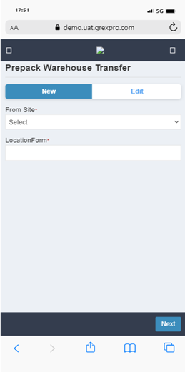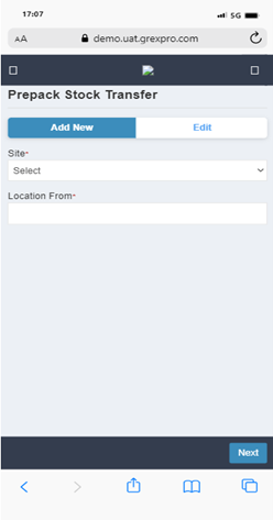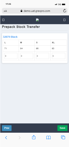 To perform Prepack Stock Transfer, you need to select Site, followed by entering location in the text box. Here you can see a list of all stocks available at that particular location; you can select an order for which you want to perform Stock Transfer operation and click on Next button. In the next screen you can see a list of items in selected Stock, put number of items you need to transfer of that stock and click on Save button. The Stock transfer will be updated successfully.