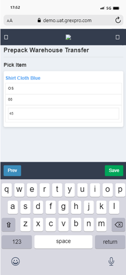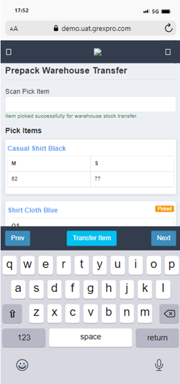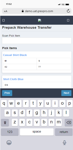 To perform Prepack Warehouse Transfer, you need to select Site, followed by entering location in the text box. Here you can see a list of all stocks available at that particular location; you can select an order for which you want to perform Warehouse Stock Transfer operation and click on Next button. In the next screen you can see a list of items in selected Stock, put number of items you need to transfer of that stock and click on Save button. The warehouse transfer stock will be updated successfully.