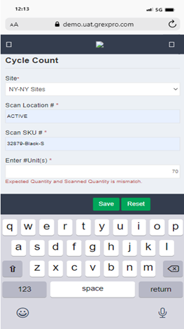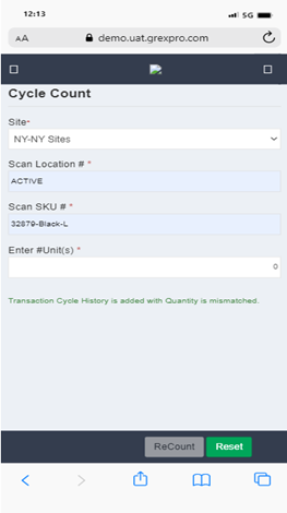 Cycle Count confirms physical inventory counts to match their inventory records. To perform cycle count process, you need to select Site, followed by entering Scan location in the text box and Scan SKU and number of unit of that Item and click on Save button. Transaction count history and quantity will be counted and saved.