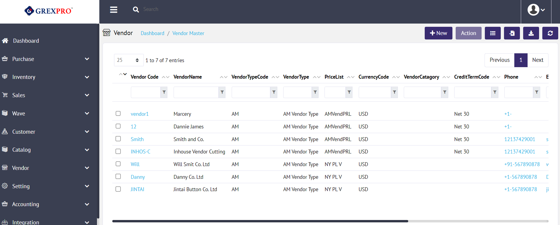 By clicking on the Master link listed under the Purchase collapsible menu, you can see a list of all vendors listed for your warehouse.