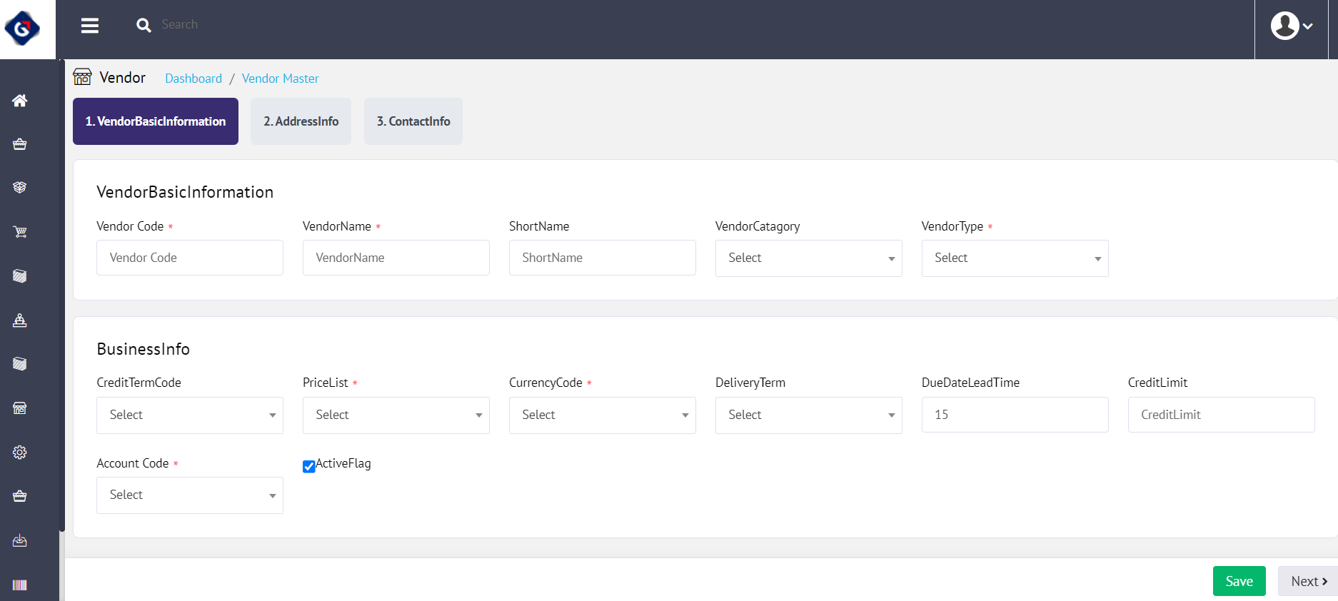 You can also add a new vendor using the 'New' button located at the top right corner of the screen. The process of adding a vendor is divided into three parts. After clicking the 'New' button, you will land on the following page, where you need to provide Basic Information, Vendor's Address and his contact details. After clicking on the Next button, it will take you to the second part.