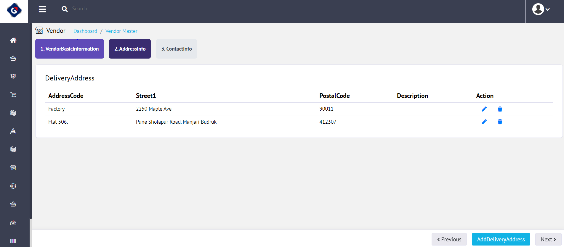 In this phase, you can add multiple delivery addresses. To add a delivery address, click on the 'Delivery Address' button located at the bottom right corner, which will open a pop-up.