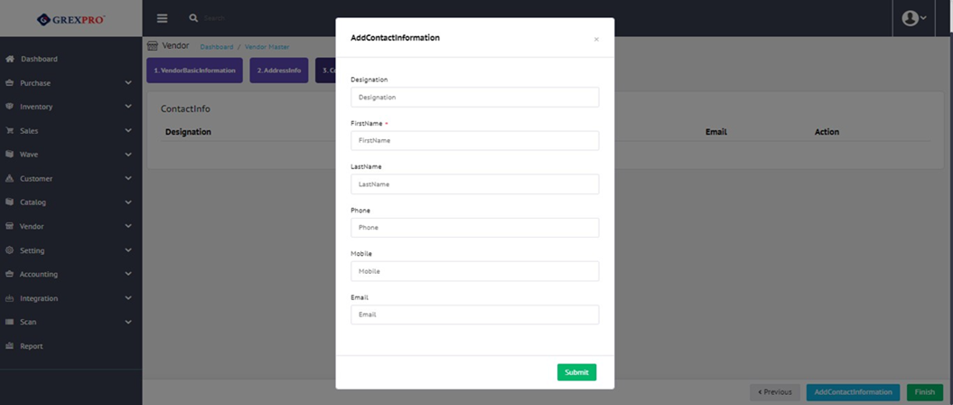 To add contact information, you need to click on the 'Add Contact Information' button located at the bottom right corner of the screen, which will open below a pop-up. Click on the Submit button after filling in all the required details.