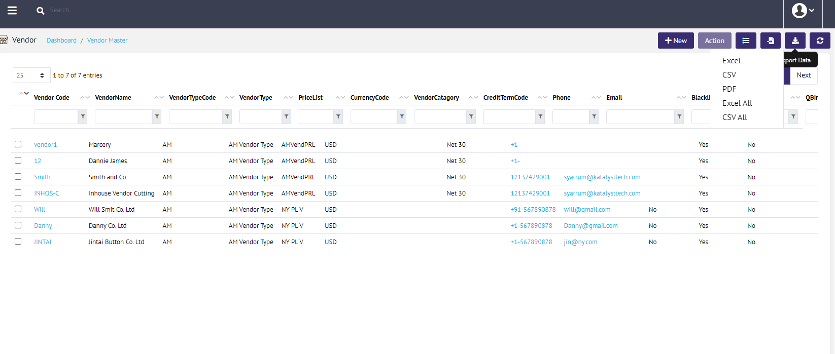 The Export button given at the right top of the screen facilitates you to download a list of visible vendors.