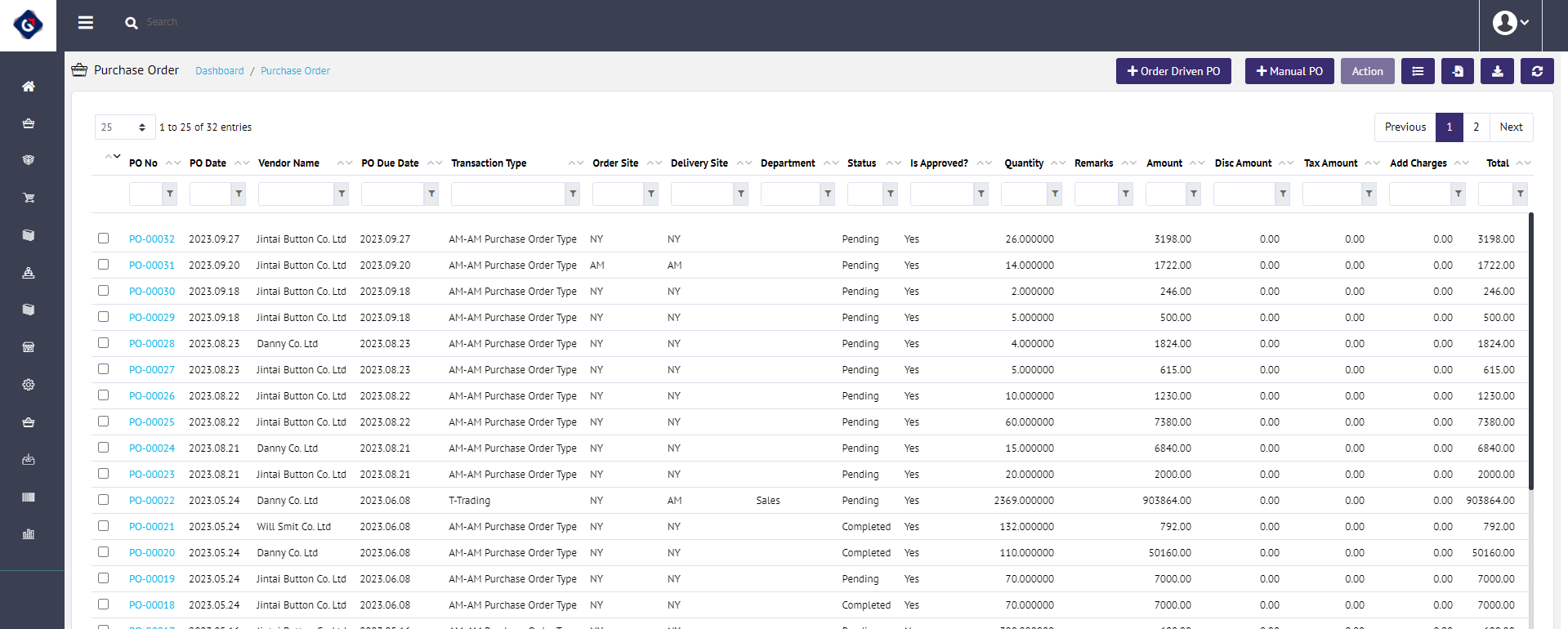 You can access this page by clicking the Purchase Order link listed under the Purchase collapsible menu. Here, you can see a list of all PO for your warehouse.