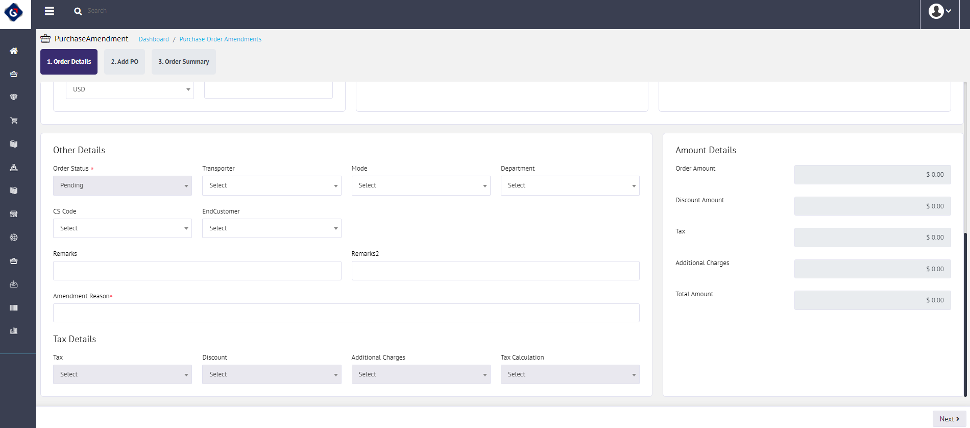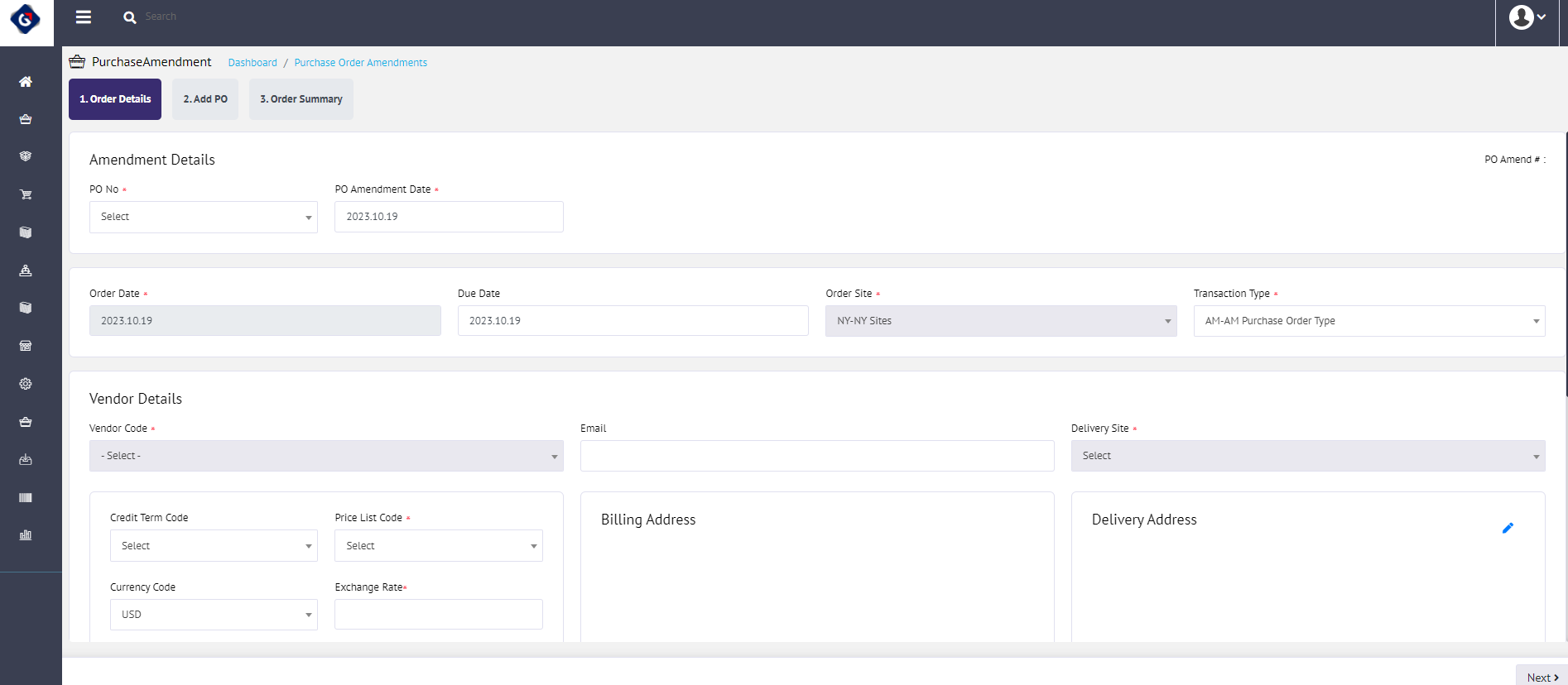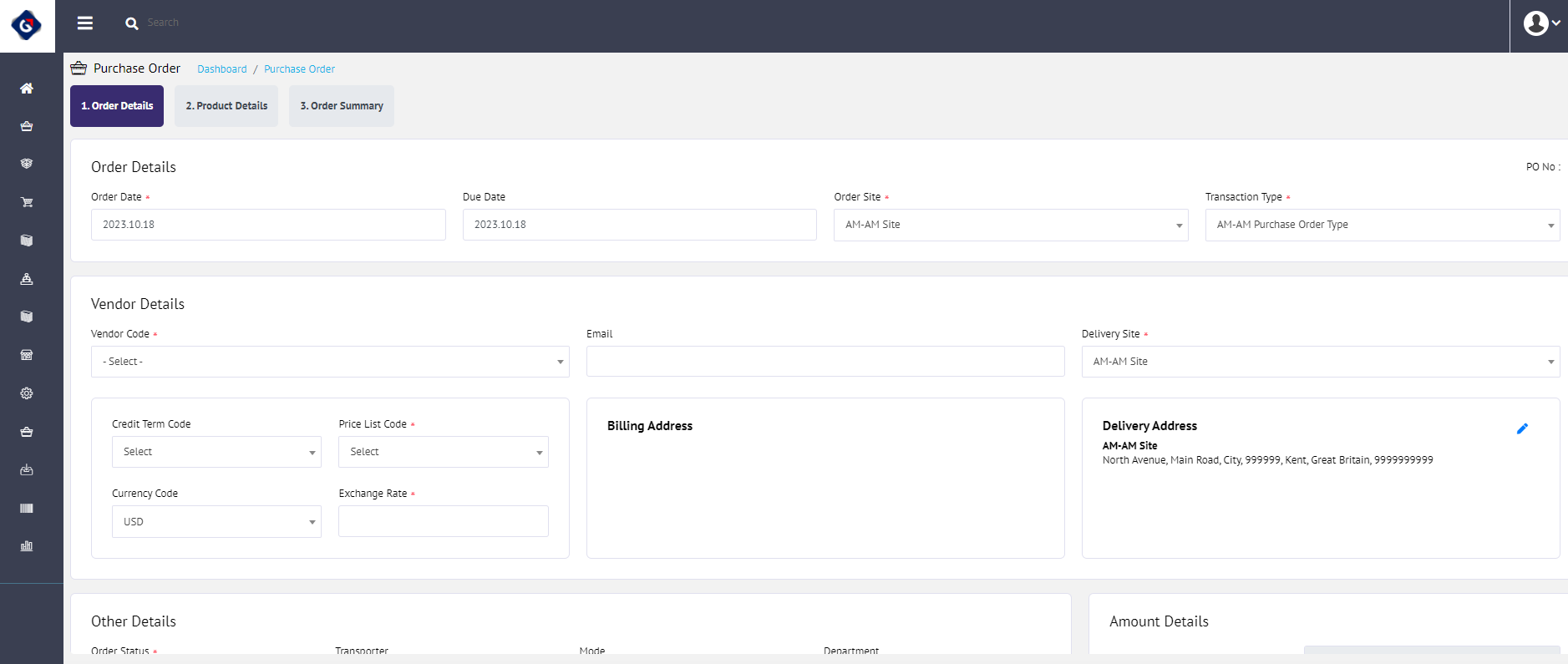 The process of adding a new PO is divided into three stages: Order Details, Product Details, and Order Summary. In the order detail section, you need to fill in details related to orders (Order Date, Due Date, Order Site, and Transaction Type), Vendor details (vendor code, delivery site, credit term code, price list code, currency code, exchange rate, email, billing address, and delivery address), Other Details (order status, CS Code, End Customer, transporter, mode, department, remarks), Tax details (tax, discount, additional charges, and tax calculation) and Amount Details (all fields in this section are non-editable and get auto-filled as you process further).