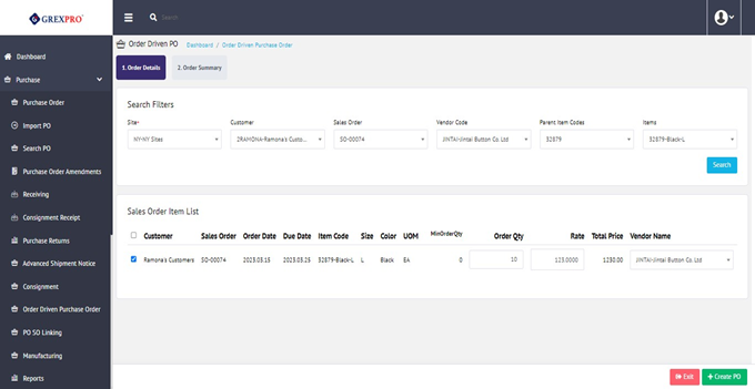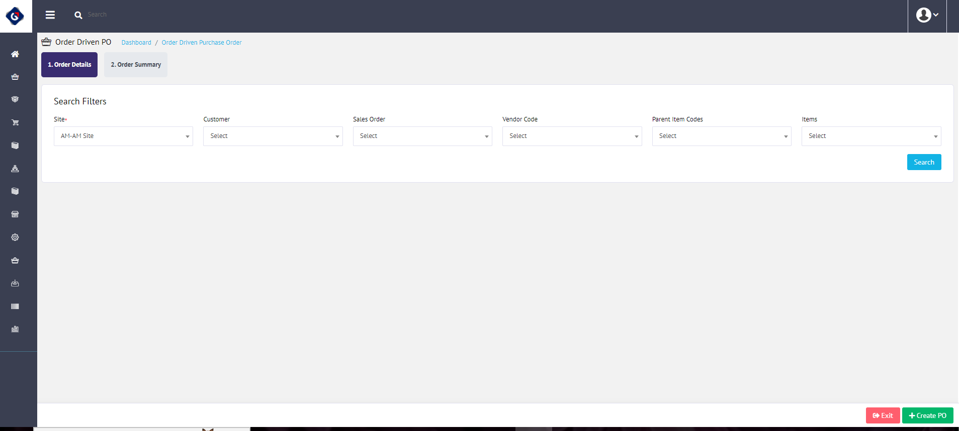 The process of creating order-driven PO is a way where you can create a new PO by selecting items from the SO system. The process is divided into two stages: Order Details and Order Summary. In the order details section, you need to select items order based on which you want to create the purchase order. You can search the items for PO from the existing SO. The item list filter can be based on different criteria like Site, Customer, Vendor Code, and Parent items: