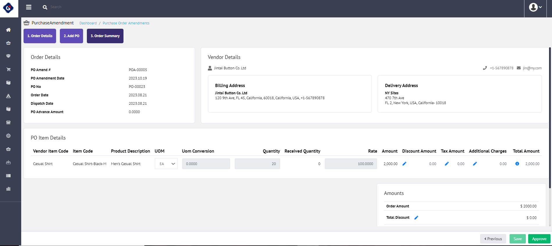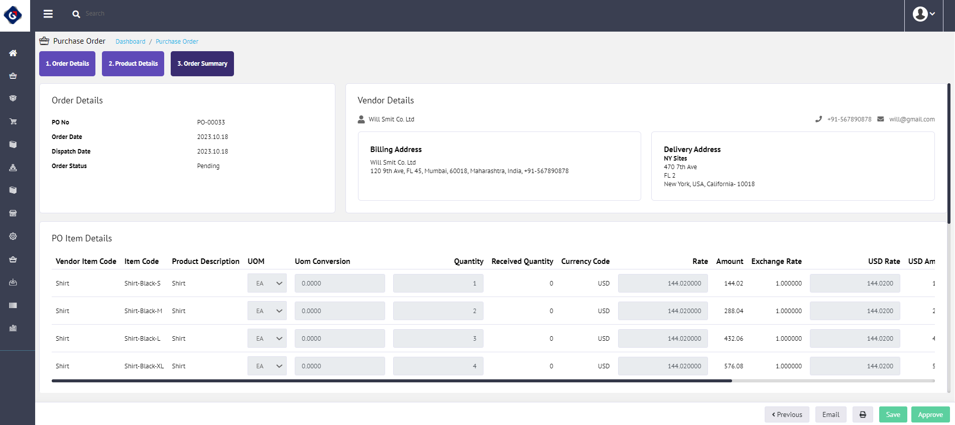 Before moving to the final step, you need to save the PO using the 'Save' button, and then you can click on the 'Next' button. Both the buttons are located at the bottom right corner of the screen. This is the final stage of adding PO. Here you can see the Order Summary and have the option to approve the PO using the 'Approve' button provided at the bottom right corner. In case, you want to make changes in the PO, you can click on the 'Previous' button and edit the product order before approving the PO. After clicking on the approve button, the system will send an email to the vendor automatically.