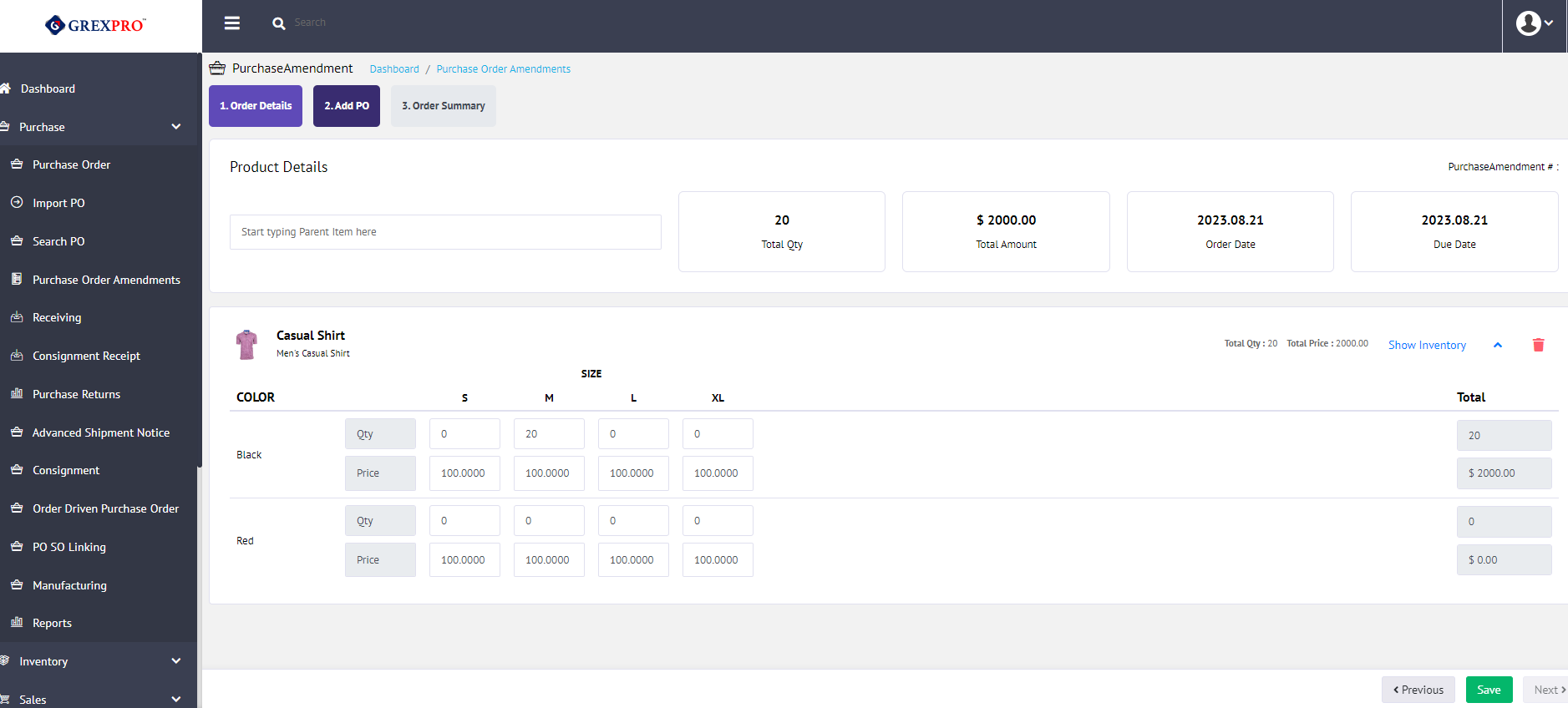 The process of adding PO Amendment is divided into three steps: as Order Details, Add PO, and Order Summary.