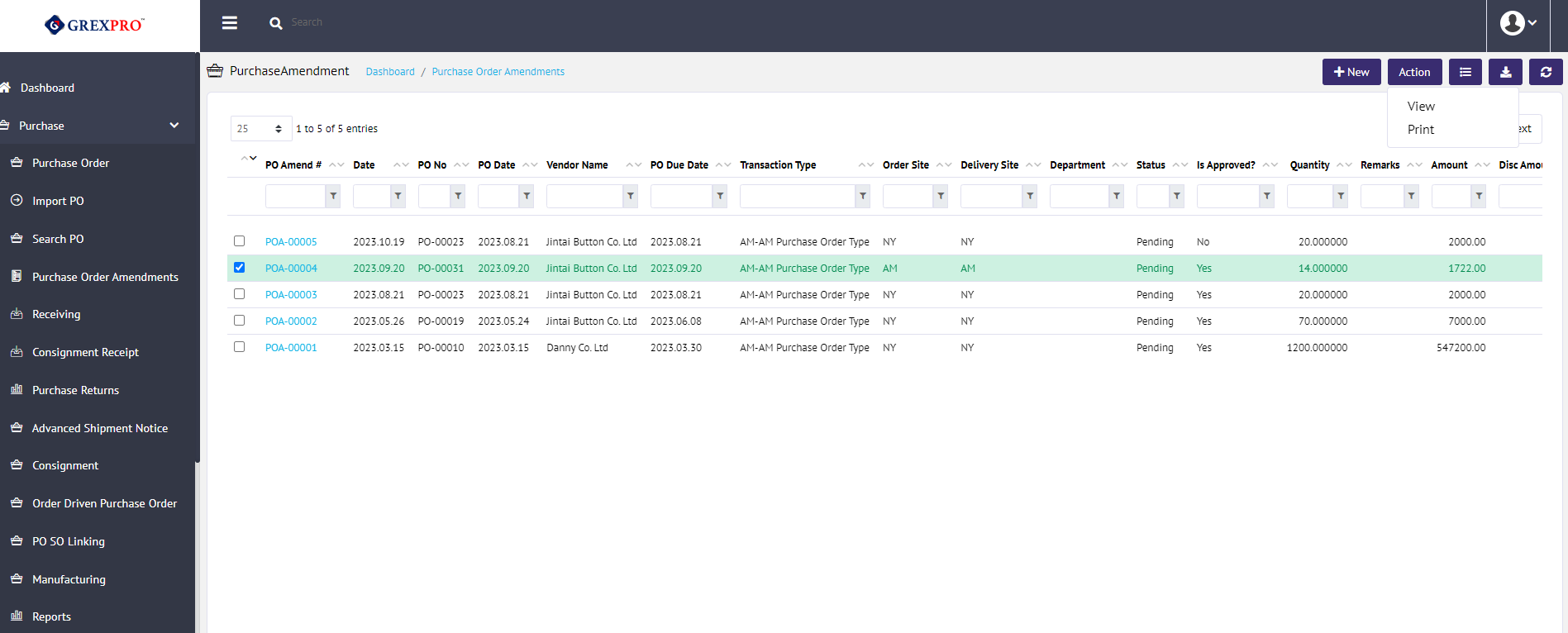 You can see an option of View only for approved PO Amendment. To view a Purchase Order Amendments, either click on PO Amendment No or select an entry which you want to view, click on the Action button located at the top-right corner of the screen, and select View from the dropdown.