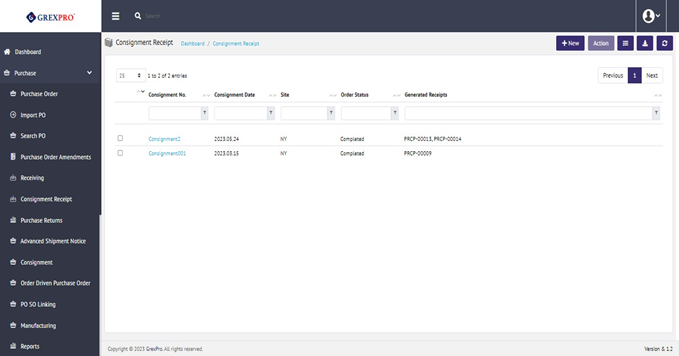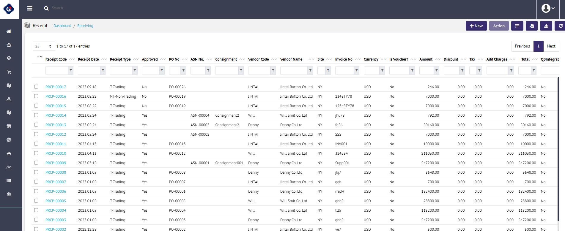 To add a new Receipt for PO, you need to simply click on the 'New' button located at top-right corner of the Receiving List page.
