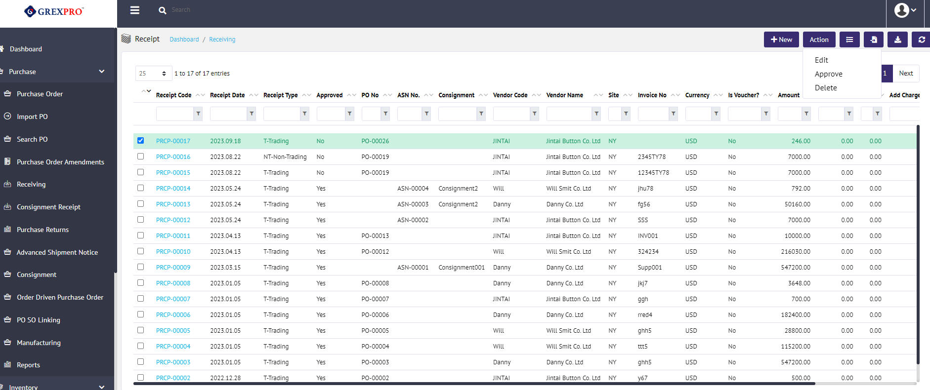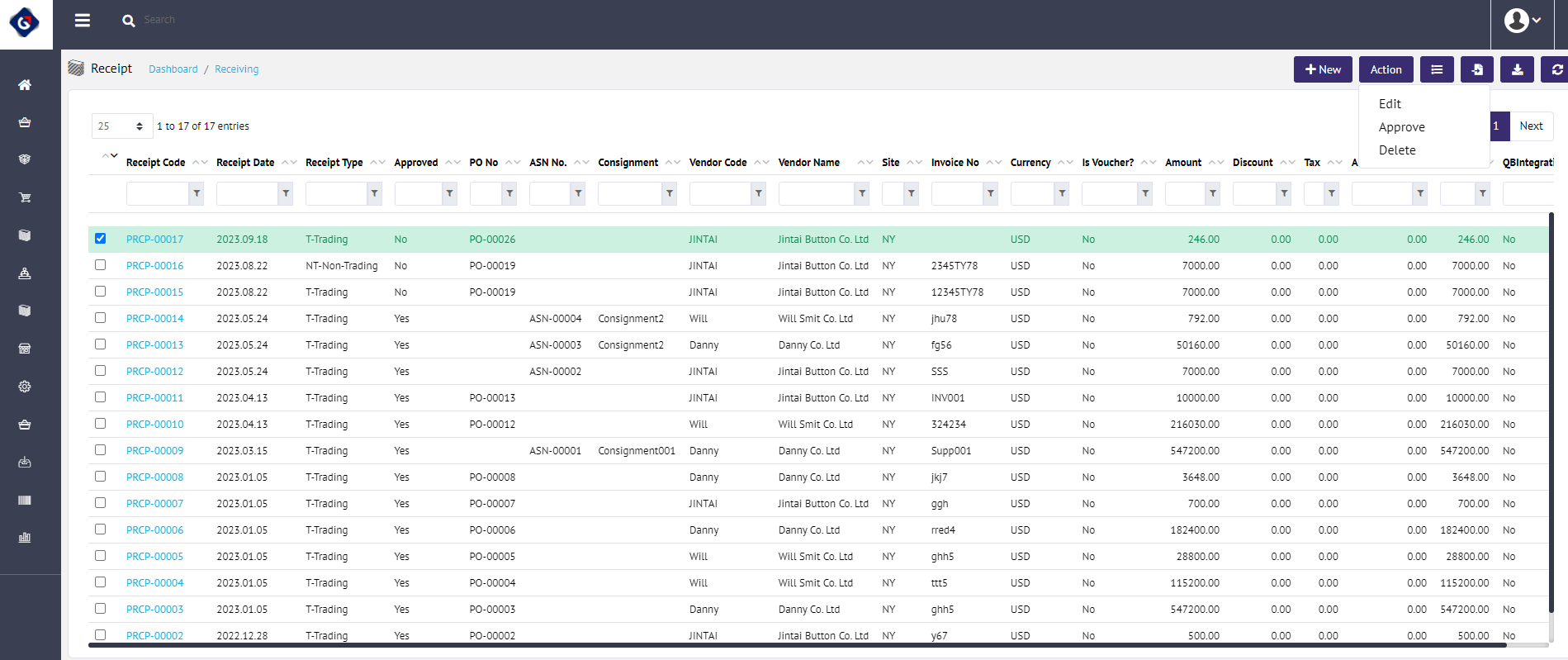 Here, you can see a list of receipts for the PO. From here, you can view receipts for already approved orders (non-editable) as well as unapproved orders (editable and can be approved from here).