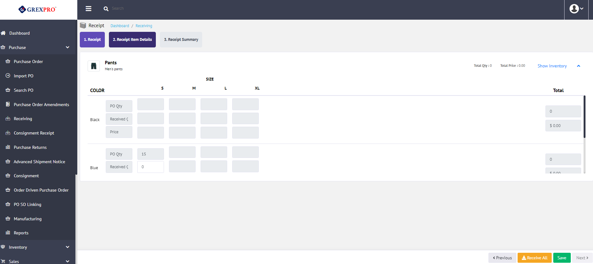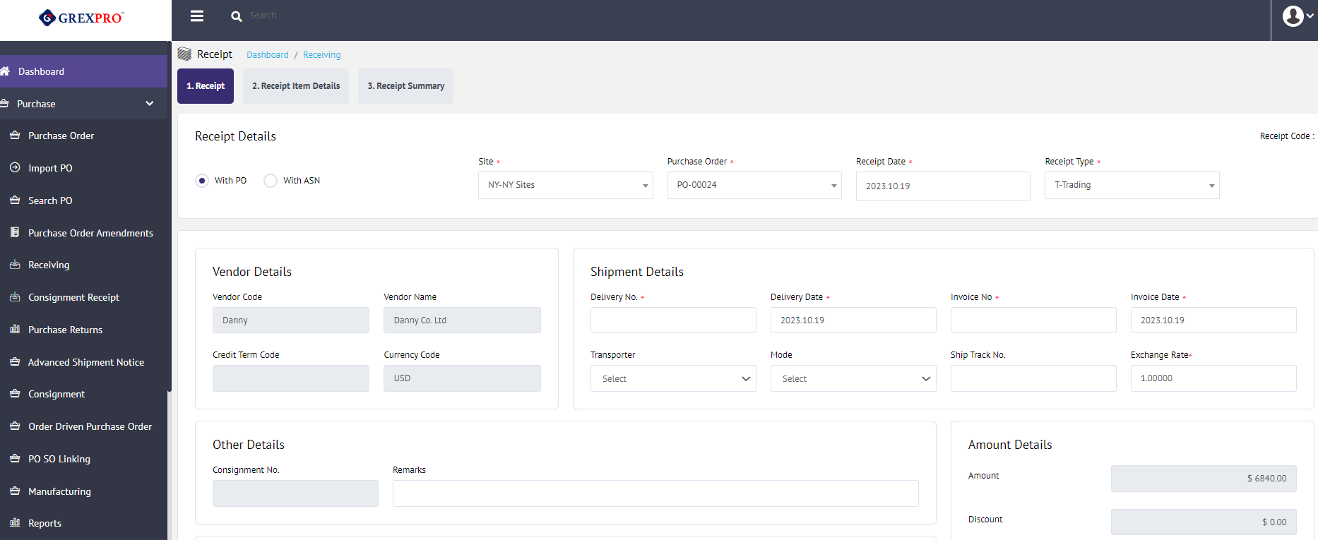 You need to select a PO No or ASN No from the dropdown to create a receipt for the specific purchase order. You can check the PO number from the PO List. Click on the Next button located at the bottom-right corner to jump on to the next step.