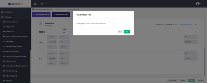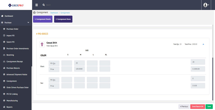 The First step is a consignment detail, where you need to create a name for the consignment and selecting PO, or ASN, or both by searching using the option given on the same page. After selecting the item for the consignment, you need to click on the Next button available at the bottom-right corner of the screen.