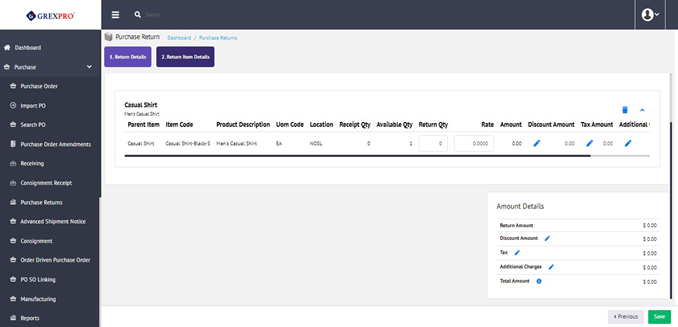 In the next step, you need to select the item and quantity that needs to be returned. Once you are done with the details that needs to be filled in, click on the Save button.