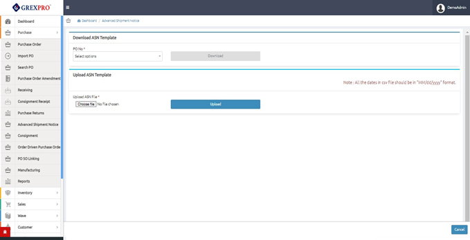 Simply by clicking on the 'Import' button placed at the bottom centre of the page, you can import details of ASNs through a CSV file.