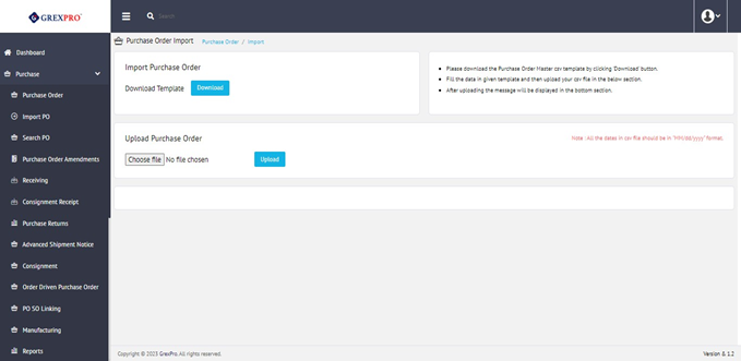 To download the CSV template, you need to select POs from the dropdown and click on the Download button next to it. You can fill in the required fields and upload the updated file using the Upload button.