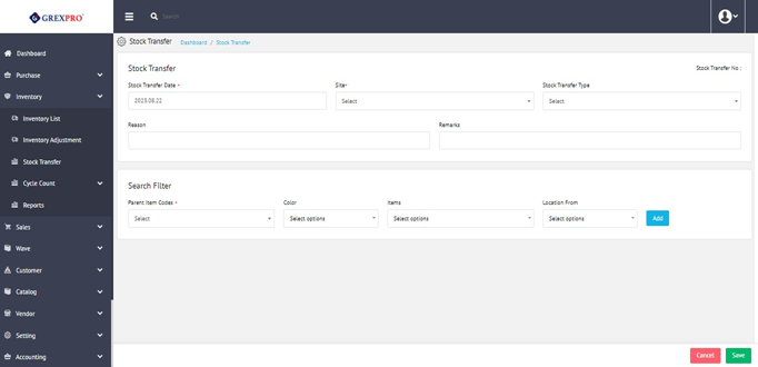 In order to add new stock transfer entry, click on the New button located at the top-right corner of the screen that will lead you to the following page: