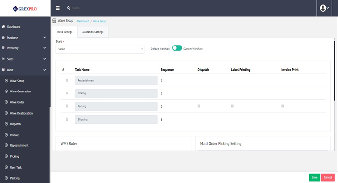 Select a Site-id from the dropdown; define tasks for workflow, WMS Rules, and Multi Order Picking Setting. After filling in all the details, you need to click the 'Save' button placed at the bottom-right corner of the screen. One site can only have one wave setup.
