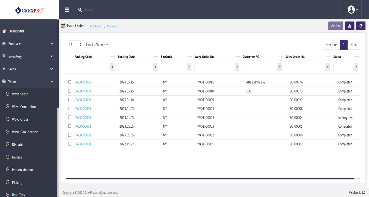 To view the pack order, either you can click the Packing Code or select an entry, click the 'Action' button and select the 'View' option from the dropdown.