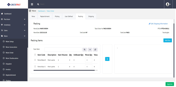 Click on the Add Box (1) button and move the item to that box using a button with the Arrow (2) symbol button followed by Save & Approve (3) button to complete the packing task.