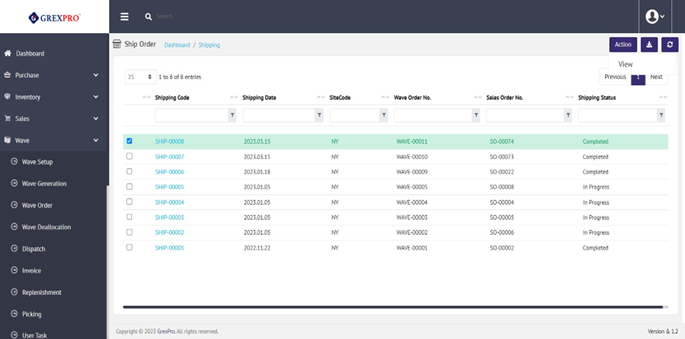 To view wave order, either you can click the Wave Order No or select an entry, click the 'Action' button, and select the 'View' option from the dropdown.